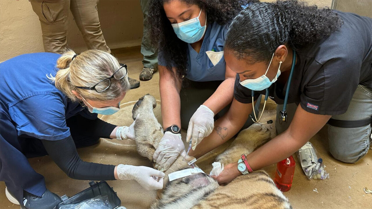 Catheter placement on a tiger for anesthetized radiographs and exam (left to right: LVTs Lisa Starr, Priscilla Perez, and Dalia Ferguson). Photo credit: Benjamin Maher, LVT ©️WCS
