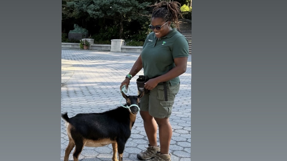 One of the Prospect Park Zoo’s goats trained to walk on a halter around the park. Photo credit: Angela Gnagnarelli ©️WCS.