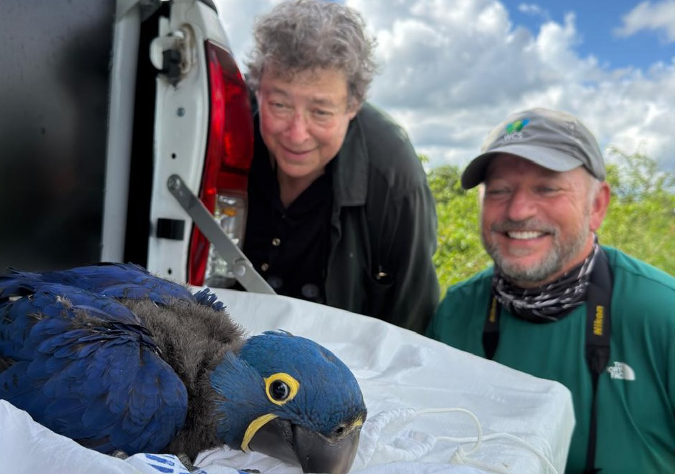 Dr. Susan Lieberman and WCS Brazil Country Director Marcos Amend observe the health of a Hyacinth macaw on a field visit with scientists from the Instituto Arara Azul (Hycacinth Macaw Institute), whose work includes monitoring nests, building artificial nest boxes, and checking on the health of macaw chicks. Photo credit: Marco Amend ©️WCS.