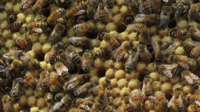My husband is a beekeeper. This is a photo of a frame from our hives showing the drone comb or nursery for the male bees. Generally, when bees start drawing (or making) drone comb, they are getting ready to swarm and leave the hive.