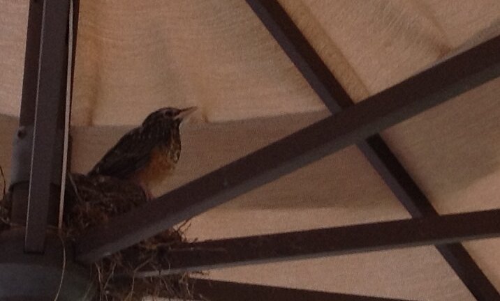 Opened our patio umbrella some time in Spring 2014. mama robin decided the underside was the perfect place to build her nest, which it was. A few weeks later or so, her four eggs hatched and my two young children and I were lucky enough to see the first one leave the nest. Beautiful!