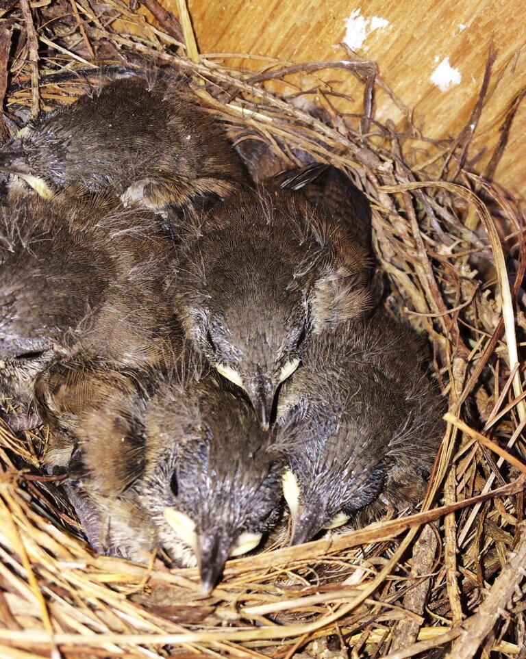 House wrens have nested in this nest box which is in my backyard for several years. This is the third of three photos showing progress from egg to feathered young. Feathered young