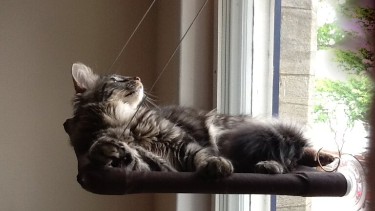 This is a photo of Indiana, a lovely cat who lives with Sergio in the UK. I make cat perches for windows that are held on with suction cups and sell them on Etsy. This photo shows the epitome of an indoor cat’s life; given a view of the critters and life outside, but snug as a bug in the house.