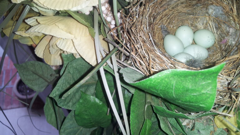 Last year a house finch took up residence in the wreath on our front door. We moved to a new house miles away in October. It appears the house finch moved with us as there is a nest in the wreath on our front door in the new house.