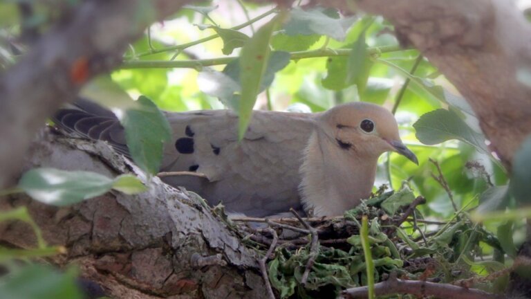 A Mourning Dove awaits the birth of her babies among the branches