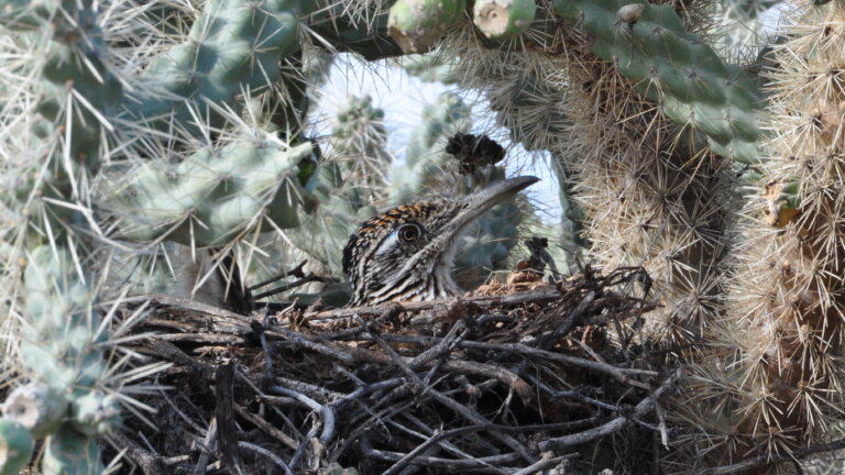 Sonoran desert roadrunner. This guy has lived around my house for a couple years, and he will follow me around like a dog. This Spring he found a girlfriend, and they currently have three hatchlings. They are attentive parents and switch off tending the nest.