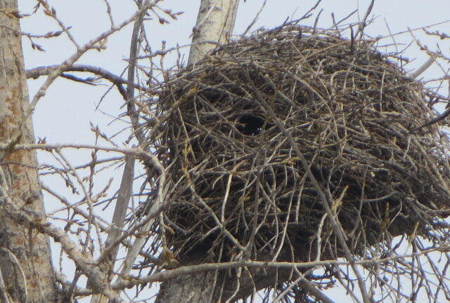 This is a magpie nest in Littleton, Co., along the South Platte River. They normally build domed nests around here, but this one is an extra sturdy hollow ball. I wonder if it’s indicative of the type of weather we will be having?