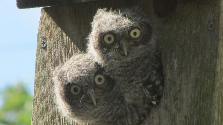 Young Screech Owls in nest box just outside window. They fledged a few days after I took the photo.
